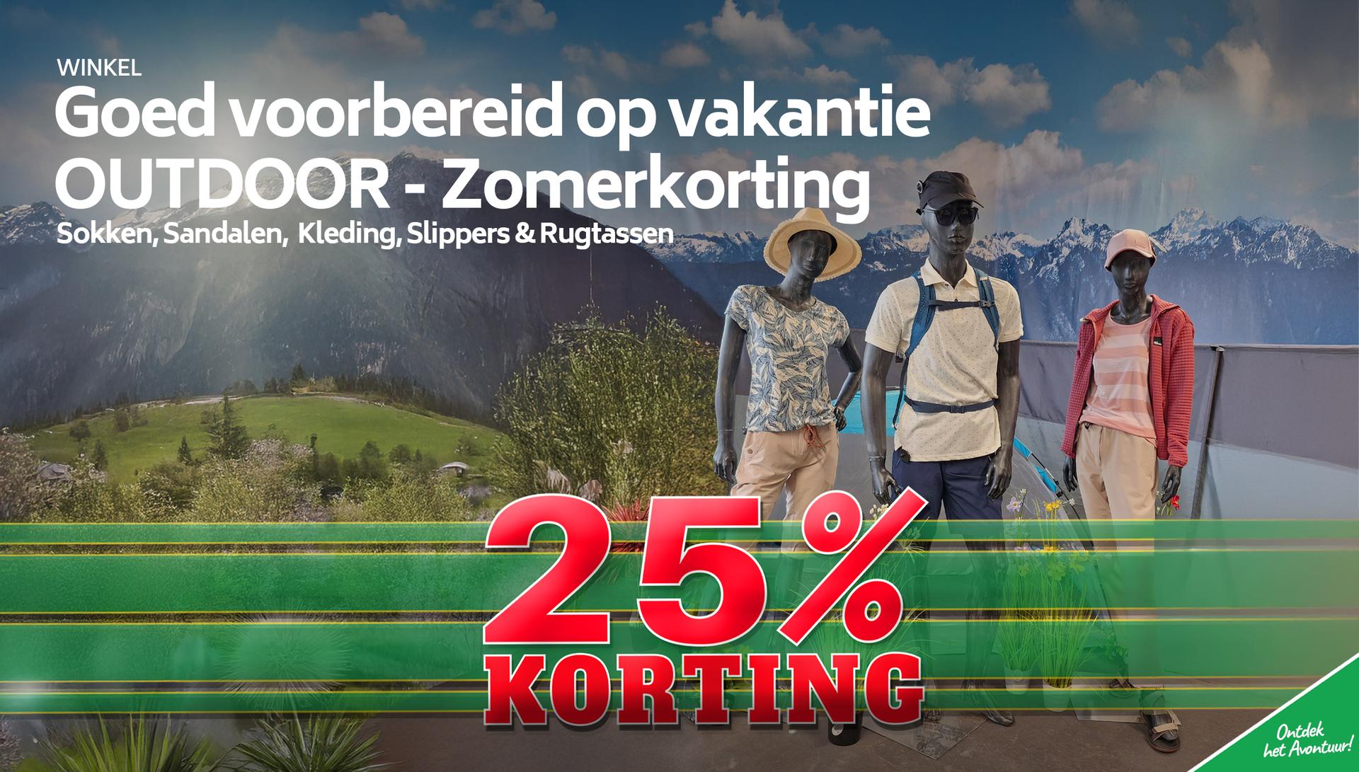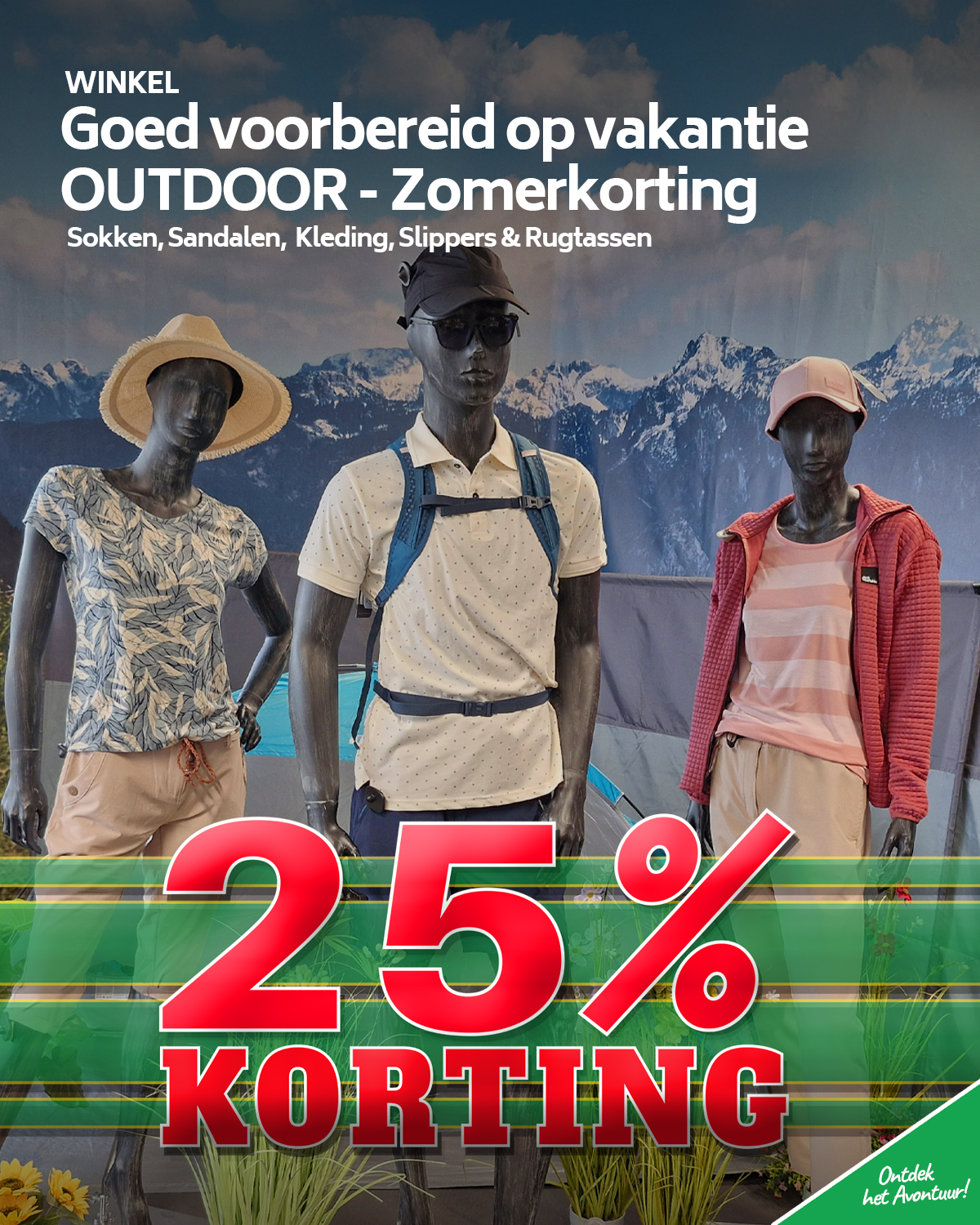 Bent u een echt buitenmens? Of wilt u deze zomer juist meer naar buiten? Dit is hét moment om uw uitrusting aan te vullen. Profiteer van 25% korting op verschillende outdoorartikelen zoals ademende kleding, comfortabele wandelsokken, lichtgewicht sandalen, slippers en stevige rugzakken. Kom langs en laat u adviseren voor de perfecte buiten-outfit!