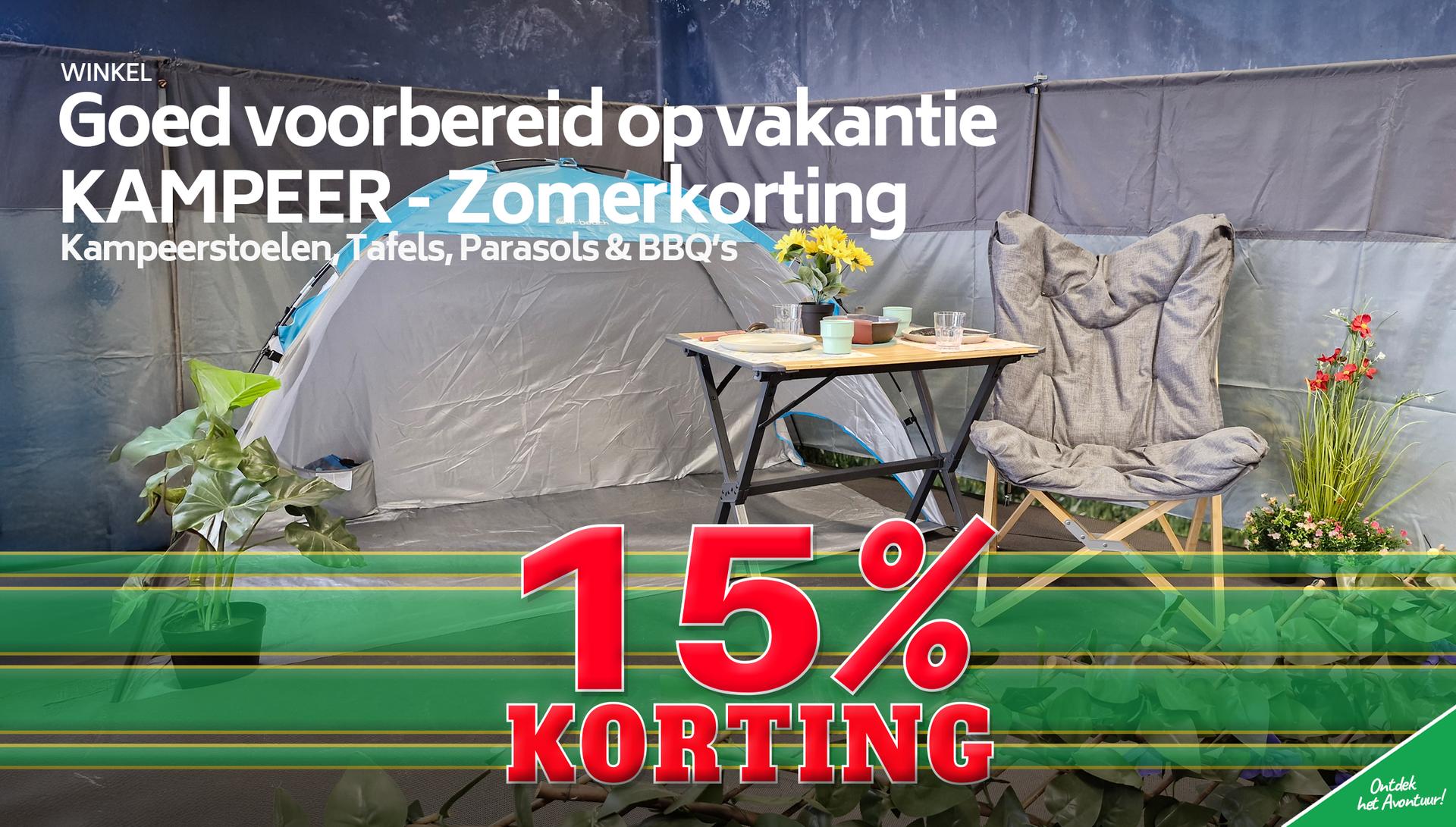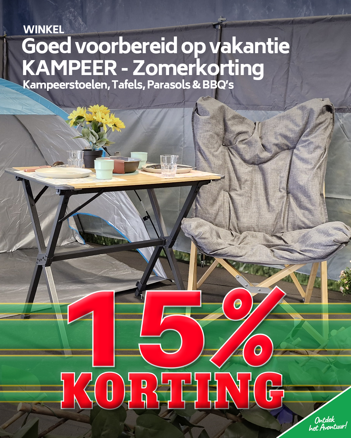 Kamperen is vrijheid, avontuur en genieten van het buitenleven. Maar laten we eerlijk zijn: met de juiste spullen wordt het allemaal nét even comfortabeler. Daarom ontvangt u nu 15% korting op een breed assortiment kampeerartikelen, zoals kampeerstoelen, inklapbare tafels, schaduwrijke parasols en de onmisbare barbecues. Kom langs en ontdek welke items uw zomer compleet maken!